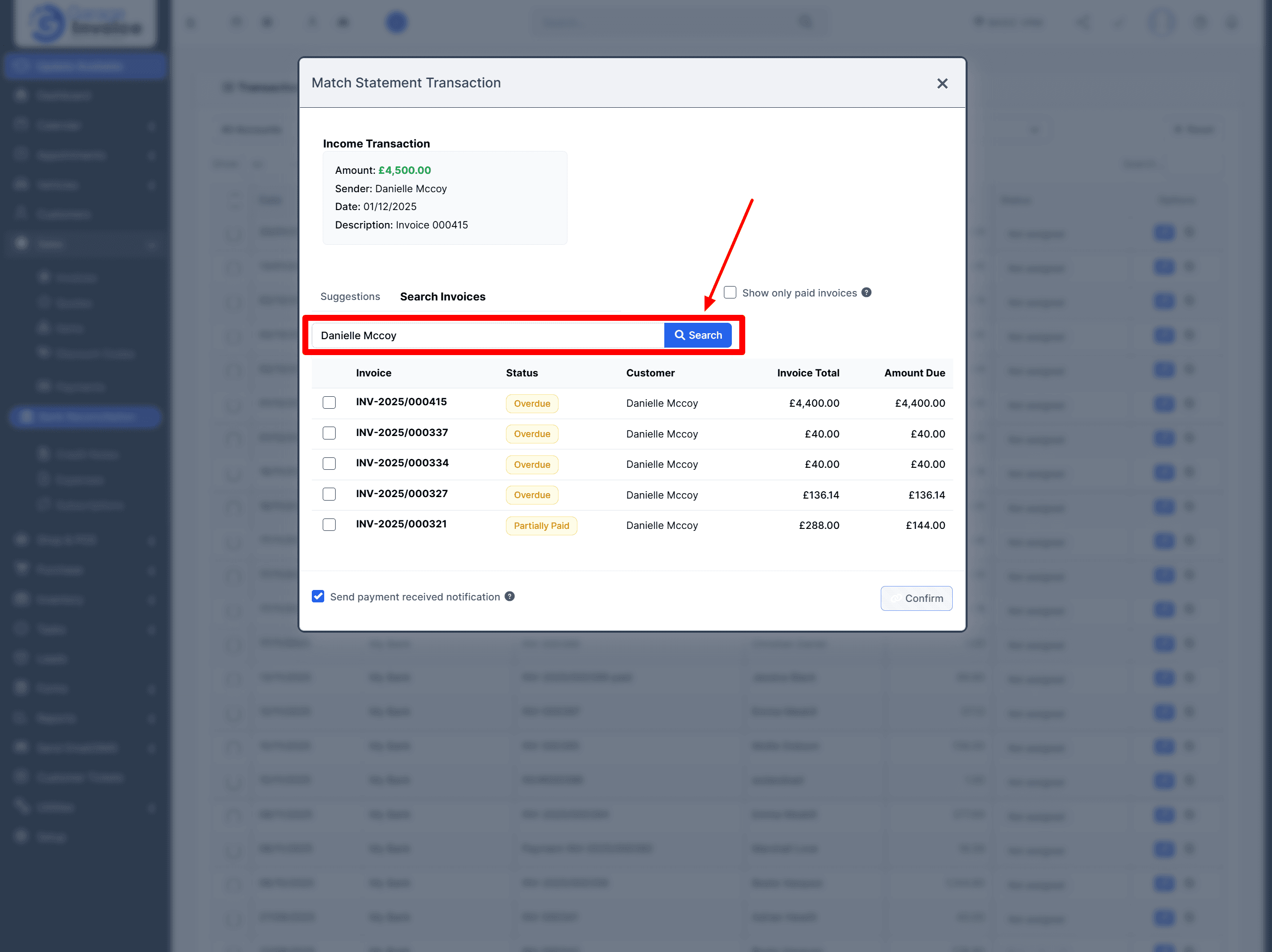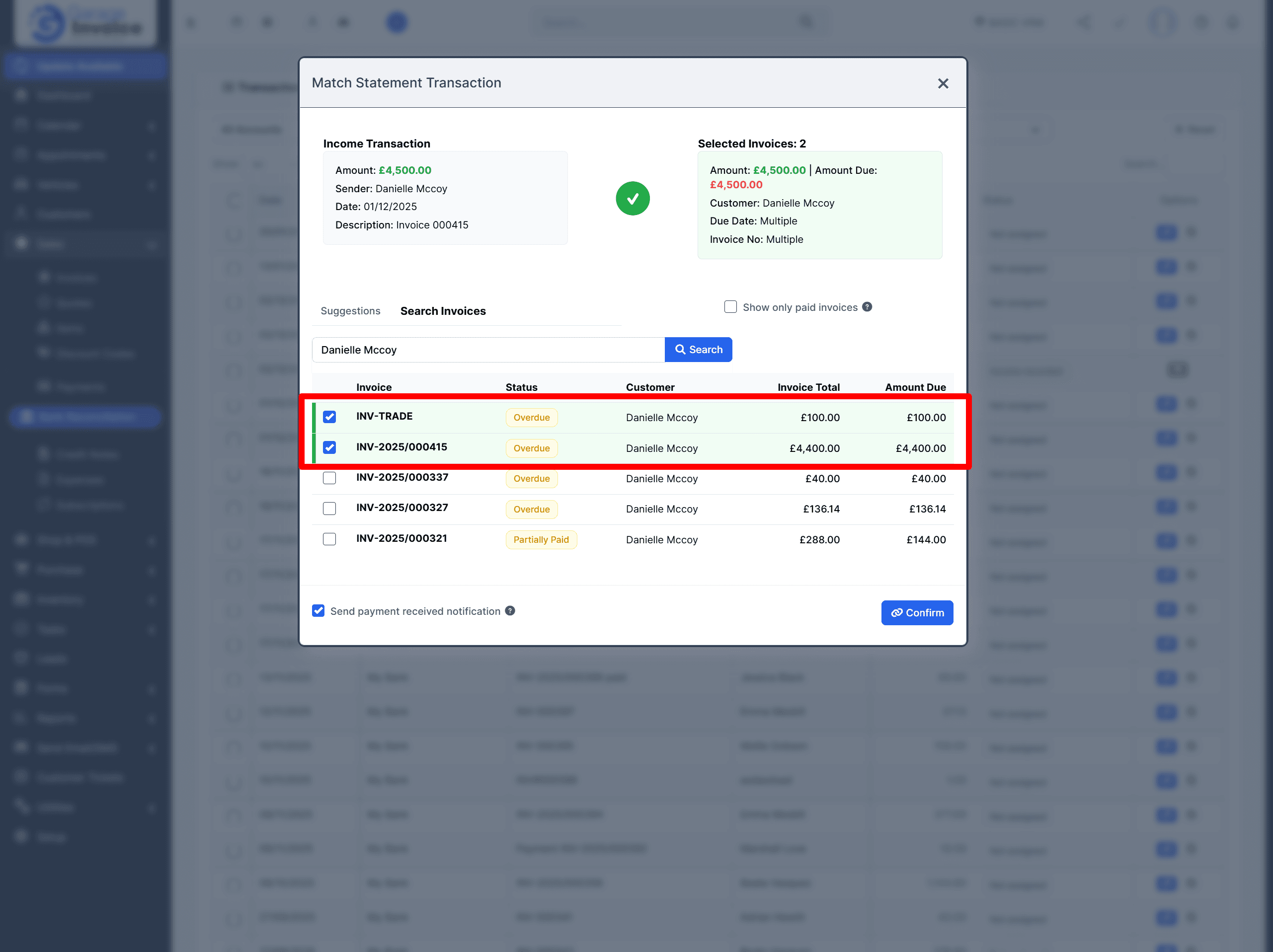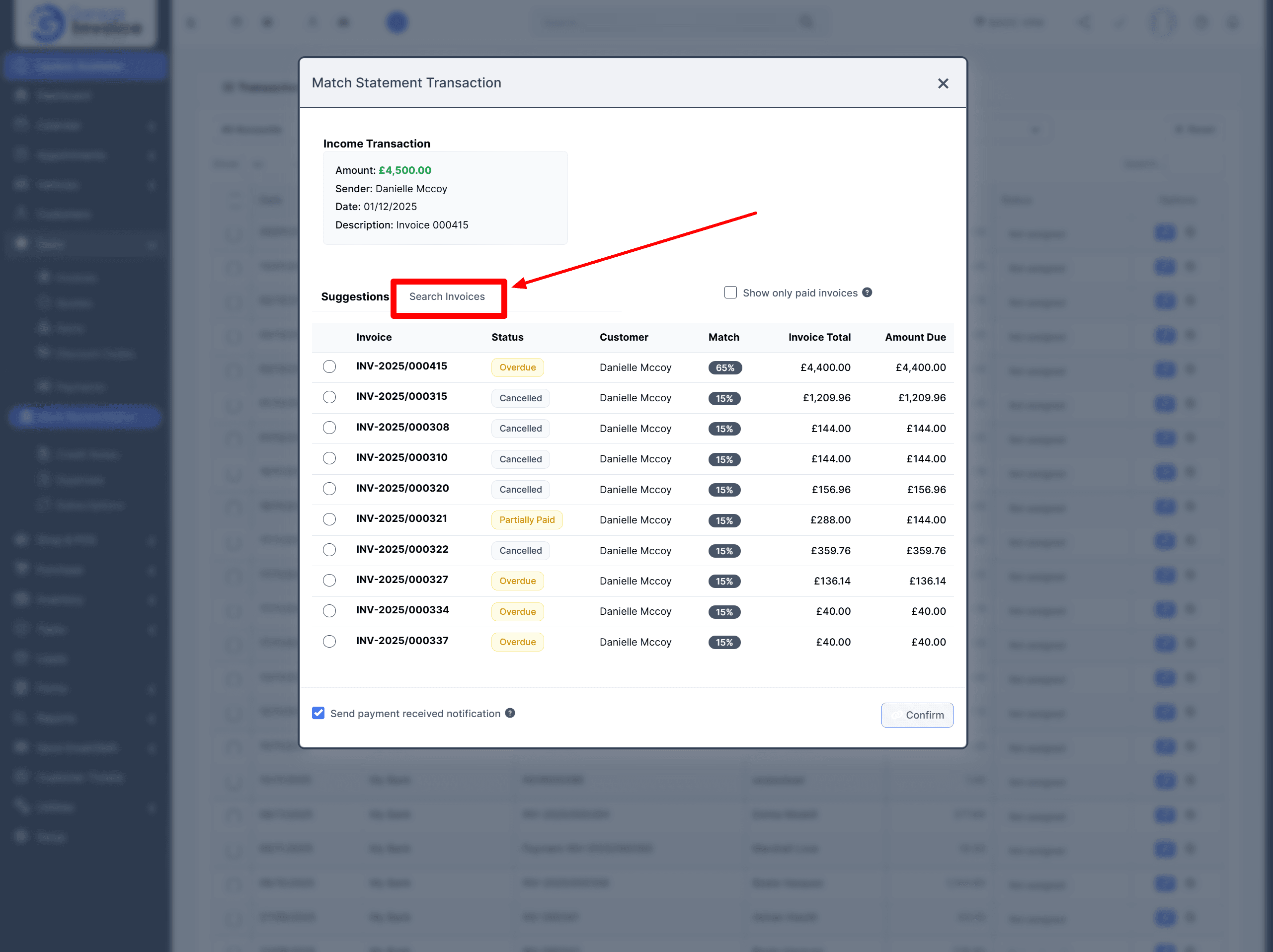 Click the invoice you want to match, then click Confirm.