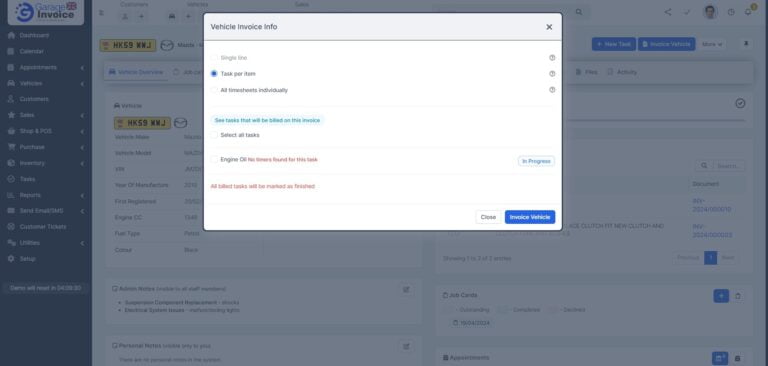 Generate invoices for vehicle work with just a click, covering tasks, expenses, and timesheets in one swift motion.