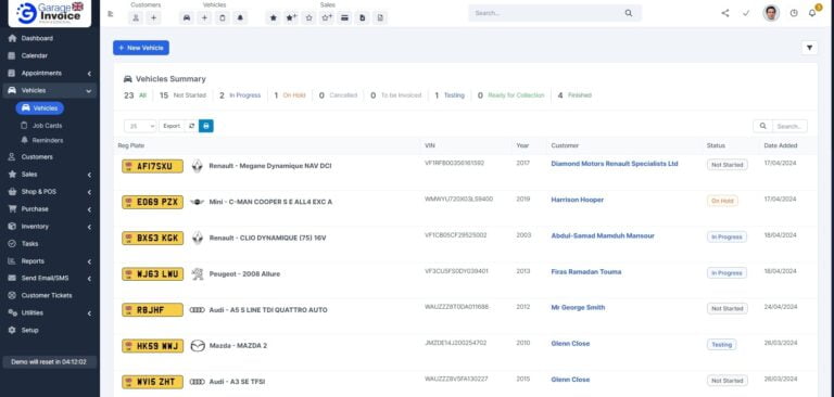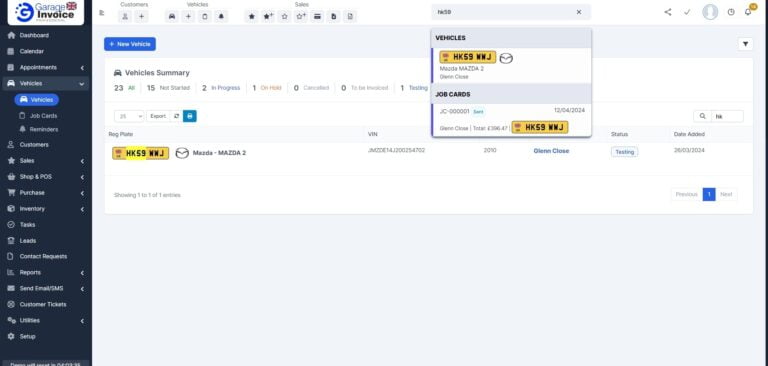 Easily find the vehicle you need by searching criteria such as make, model, registration plate, customer details, and specific invoice item lines.